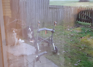 Vi besökte även Lena och Smilla. Efter att ha fått följa med i bilen under några timmar avslutade vi med ett besök i Lenas lägenhet. Hundarna nöjde sig med att vara ute i den lilla "hundgården". Här Kotten och Kiara. Fotot är inte så värst bra eftersom jag tog det genom fönstret. Smilla låg precis nedanför fönstret och är utanför bilden.
