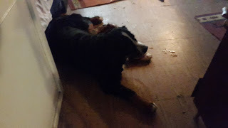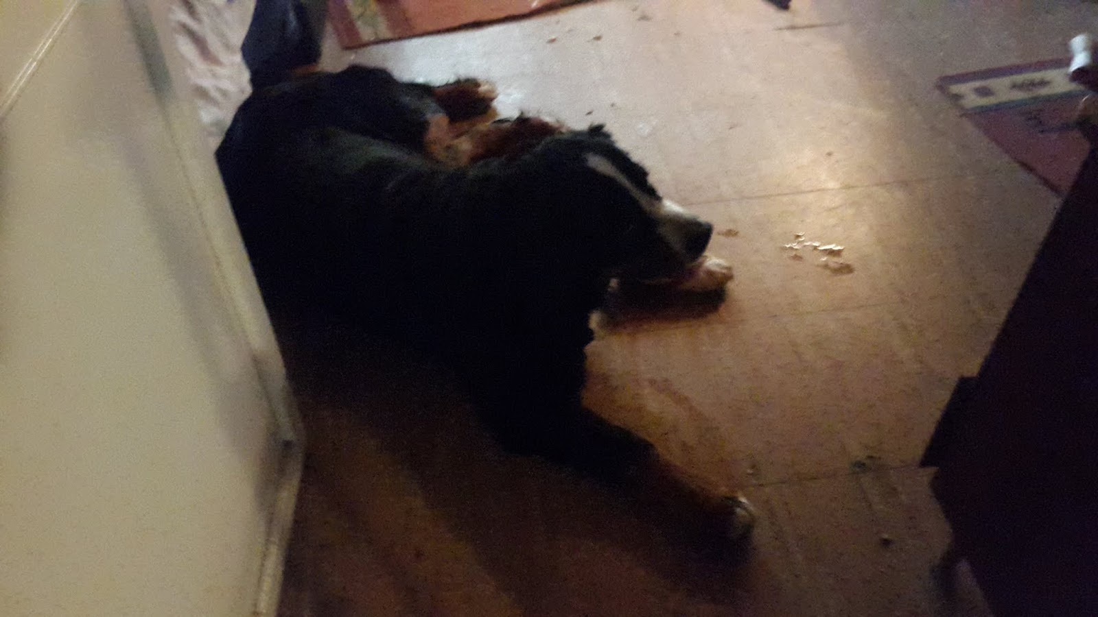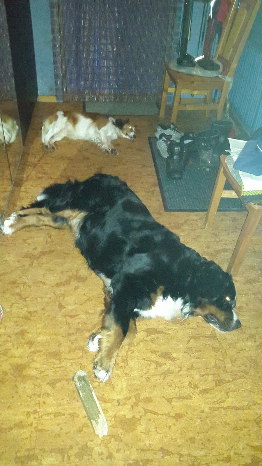 Efter en sådan utflykt ligger hundarna utslagna på olika ställen. Kotten med sin samling av sönderbitna pinnar, fällen borstas dagligen, men blir lika snabbt full med småpinnar igen. Det ska vara så tycker Kotten.