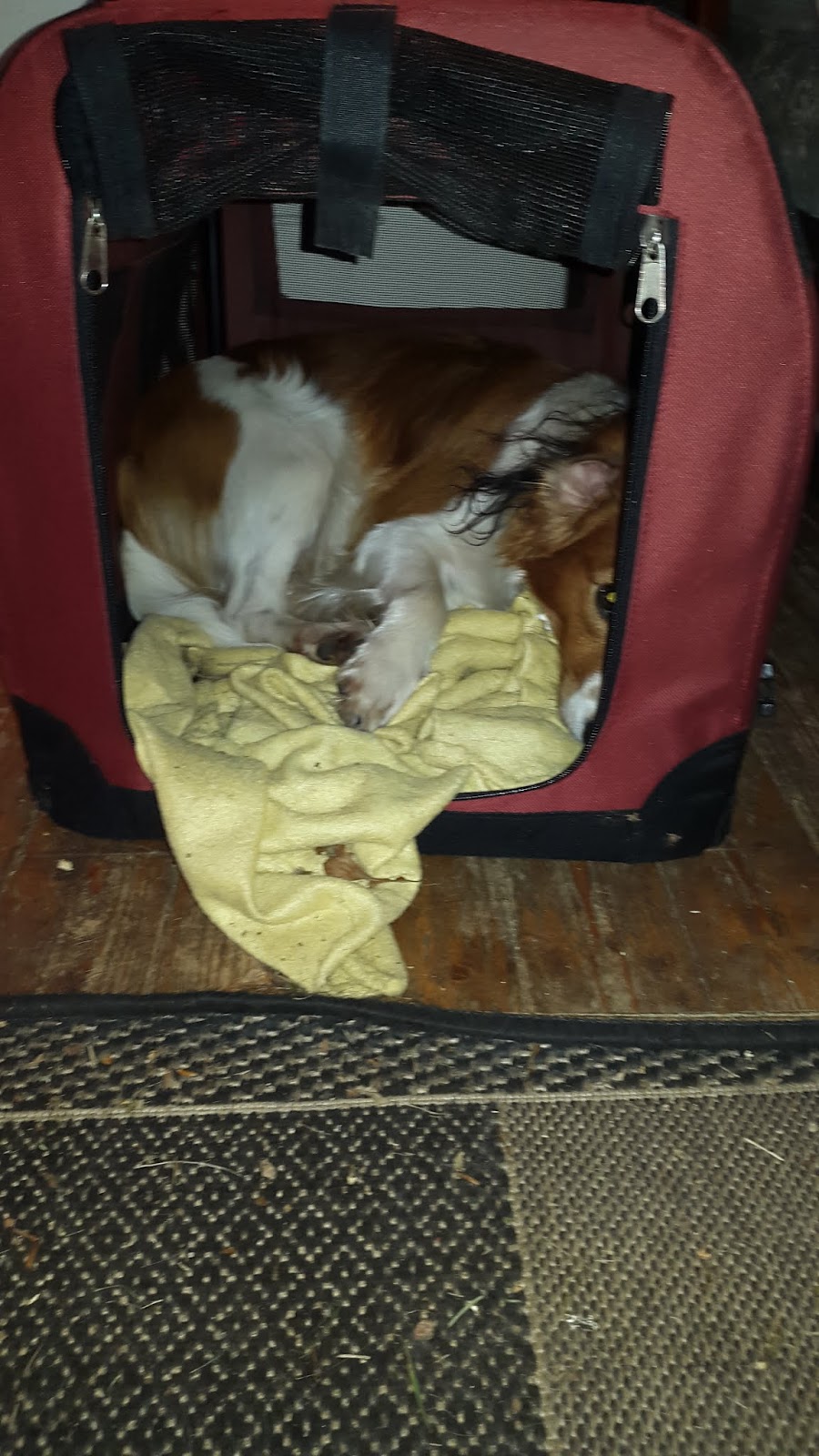 Inför natten tyckte Kotten den bästa sovplatsen trots allt var i transportburen.
