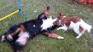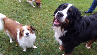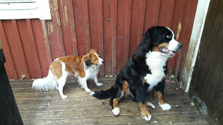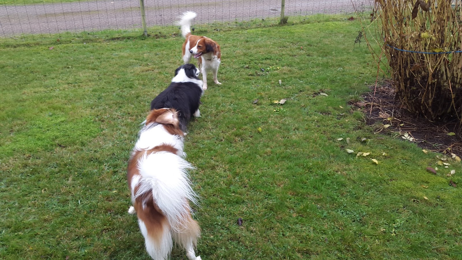 Kooikerhunden Kotten får besök av Berner Sennenvalparna M och M .