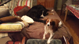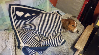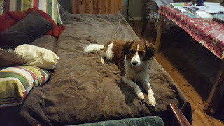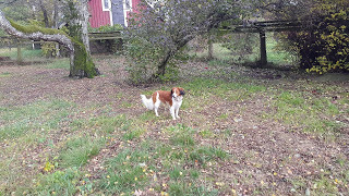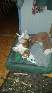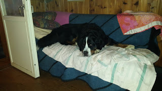 Jag lät hundarna vara ute på tomten och utforska den, medan jag bäddade om soffan till en tvåbäddssäng för oss alla tre att vara i. Något som verkligen uppskattades av hundarna. Ser du fåtöljen som Kotten håller ena tassen i? Ibland kröp han upp i den och rullade ihop sig till en liten boll.