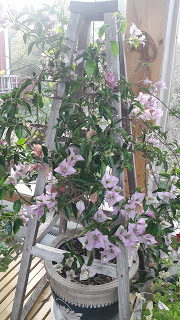 Min bougainvillea är så vacker, men också lite rolig. Den har djuplila blommor ända tills jag plockar in den, då blir alla blommorna rosa...