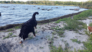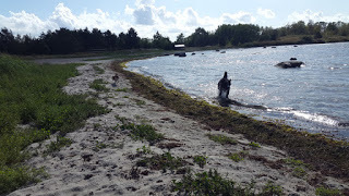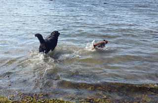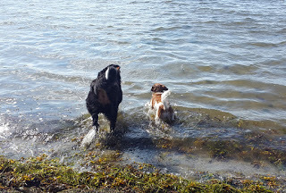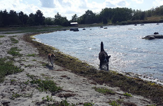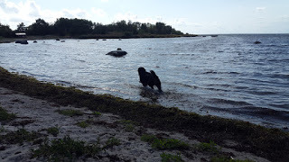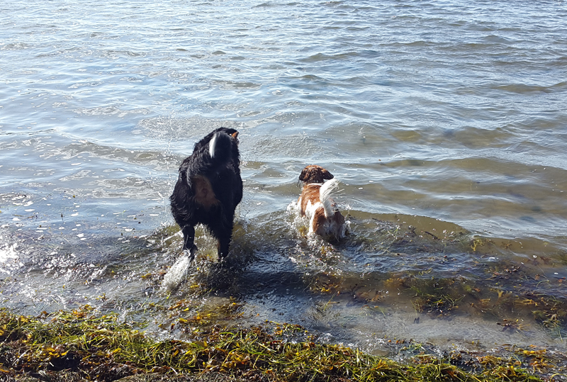 På torsdagen blev det sjukgymnast under två timmar. Sedan stapplade jag till havet och lät hundarna bada i havsvatten för första gången. Kotten älskade det. Han studsade över vågorna, nafsade efter skummet och sprang som en galning fram och tillbaka. Kiara tyckte också om vattnet, men hon lufsade bara lugnt fram och tillbaka och såg efter Kotten när han for förbi. Hon har inte en chans att hinna med honom.