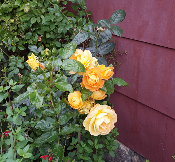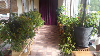 Har just vattnet blommorna i glasgången, där busktomaterna är fulla av tomater. Kiara går och mumsar på buskarna, Kotten plockar de tomater som ramlar av. Solen skiner in genom fönstren och får de orange, röda och gröna paprikorna att glänsa. Vilken rikedom att ha alla dessa egenodlade grönsaker att mumsa på. Det är även lycka för mig.