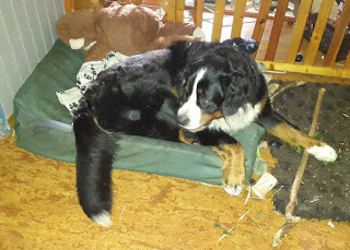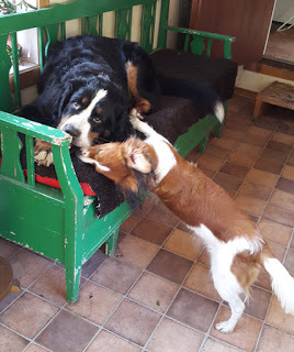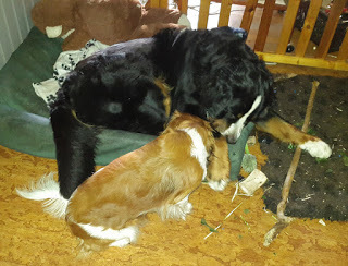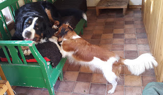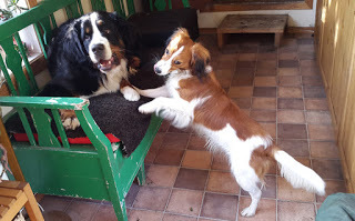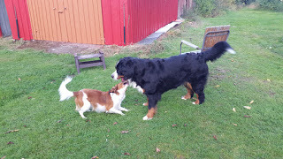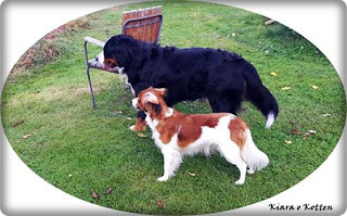 Kooikerhunden Kotten får besök av Berner Sennenvalparna M och M .