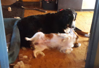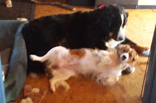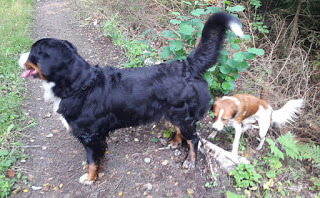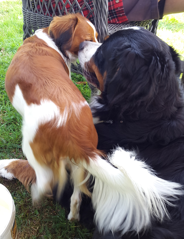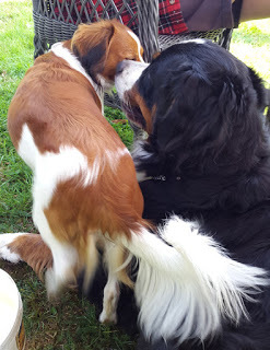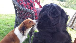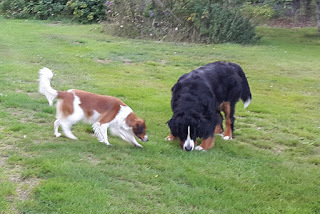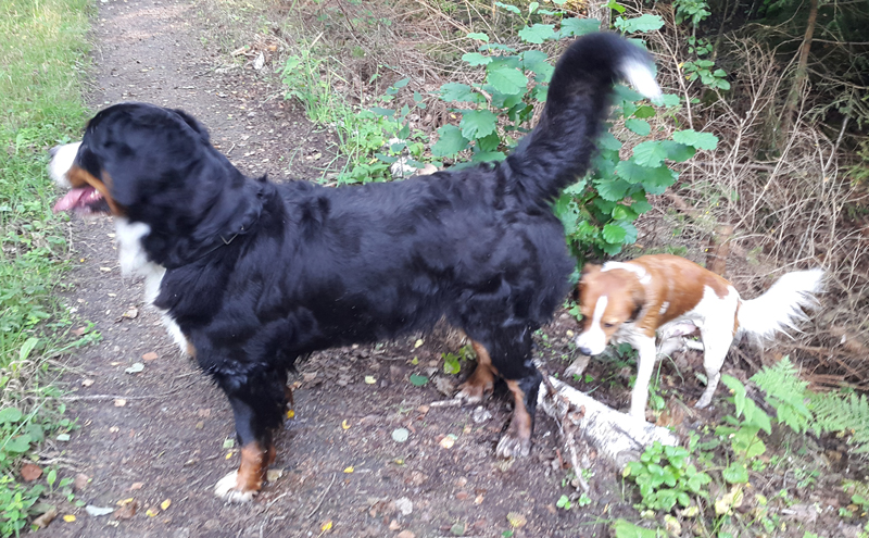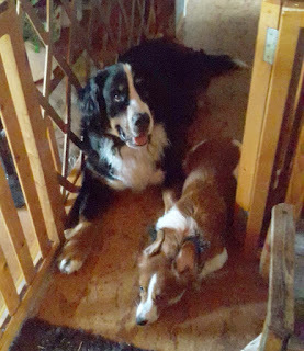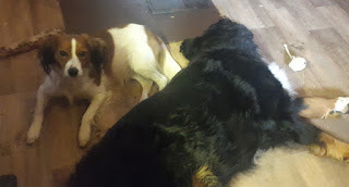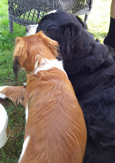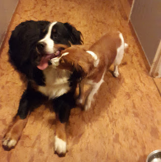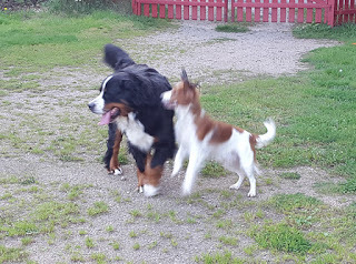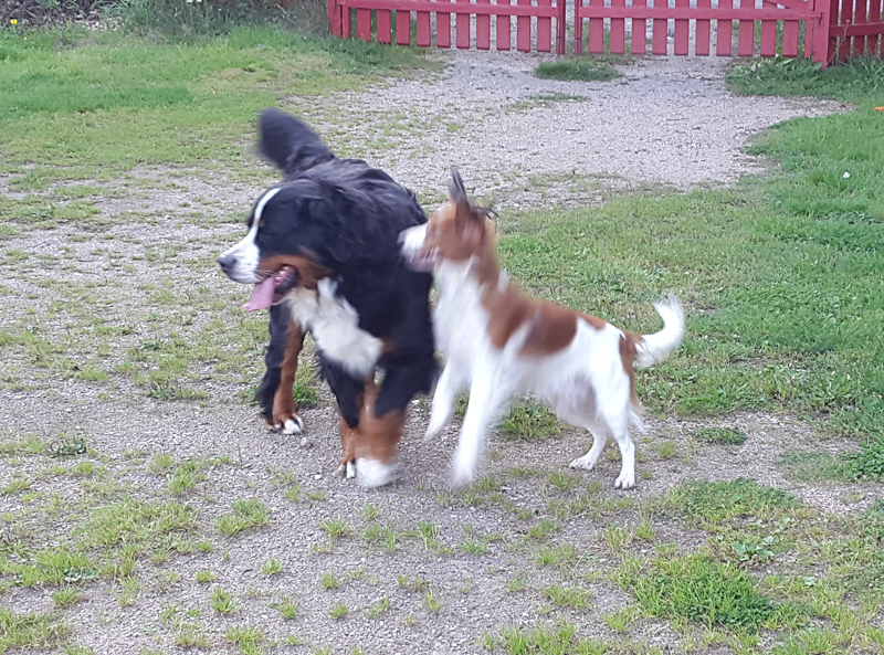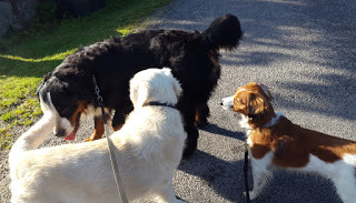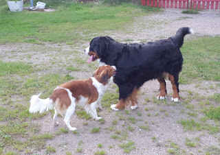 Kotten började fortsättningskurs på Ronneby Brukshundsklubb. Han älskade det. Extra glad blev han över att träffa storpudeln Boris som han gick grundkursen med. Det har varit full fart även denna veckan. Vi har besökt Kiaras uppfödare Lena, haft besök av Berner Sennenvalparna M och M (då jag glömde fotografera), flera gånger har vi mött grannen med goldenhunden Frida, och vi har mött nya kor. Dessutom har Kotten gjort sitt första långa arbetspass i skrivarlyan, något han genomförde med bravur. En spännande vecka, som vanligt.