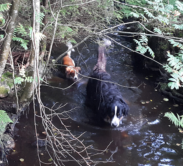 Eftersom det var så varmt gick vi till badbäcken. Tyvärr var vattennivån inte lika hög som vanligt, så Kotten kunde inte simma och Kiara fick bara vatten upp till magen. Men de verkade nöjda ändå.