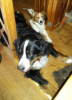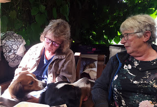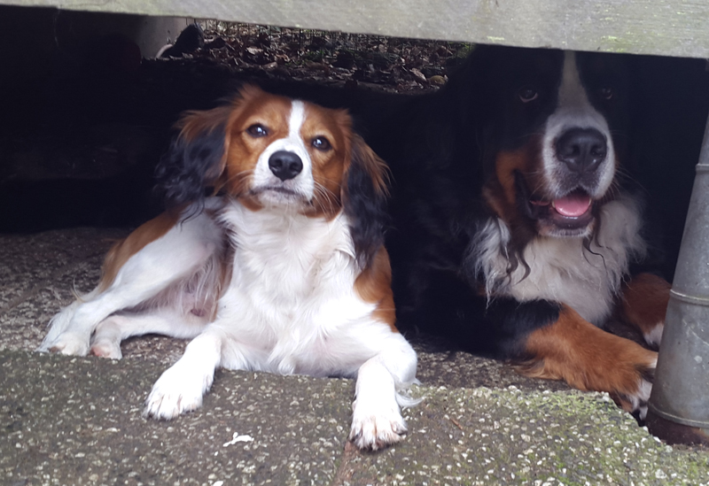 Båda hundarna är alltid nära oss när vi är ute i trädgården.