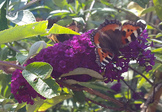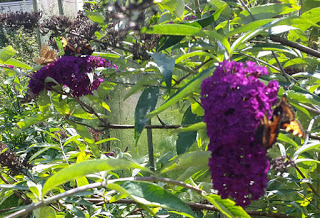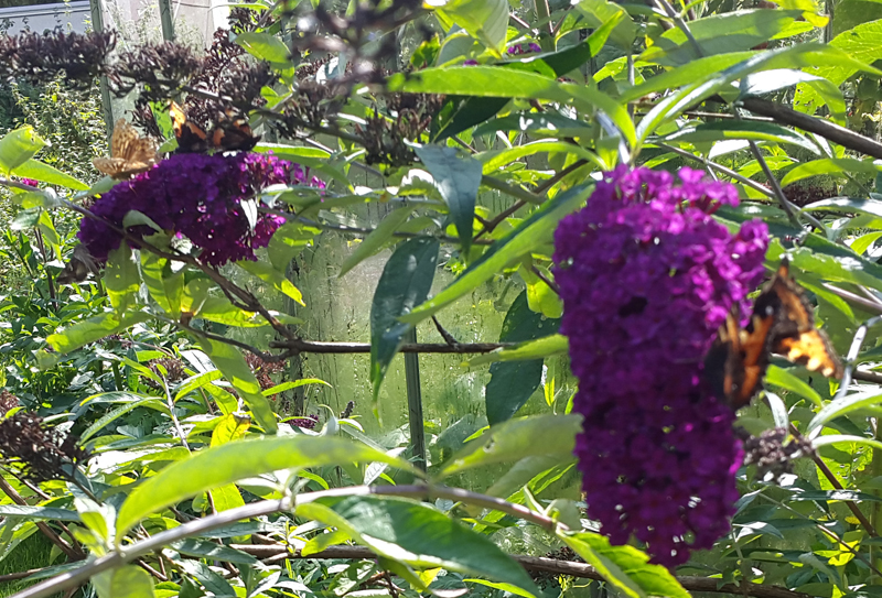 Fjärilsbusken är också överfull med fjärilar. På den bortre blomman sitter tre fjärilar.