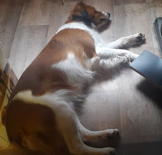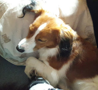 Till slut tyckte hundarna det blev för varmt och kröp ner på golvet vid mina fötter istället, då kom äntligen solen och tittade in. Kotten sover skönt med huvudet på den stora kudde som jag lagt vid soffan för att han lätt skulle kunna hoppa upp och ner som valp. Han använder den fortfarande och blev lite ledsen en dag när jag hade tagit bort den. Jag trodde inte att han behövde den längre...