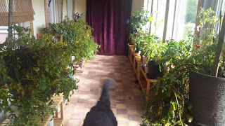 Utomhustomaterna 100/1000 har fått flytta in. Där sitter jag på en pall och plockar tomater med hundarna som sällskap. Kotten börjar tycka om tomaterna, och lär väl plocka själv snart.