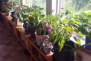 Även paprikaplantorna har flyttat in. En av plantorna är kvar sedan förra sommaren och fram till november förra året gav den oss orange paprikor. Nu tänker jag spara alla fyra paprikaplantorna för att se om det fungerar även den här vintern.