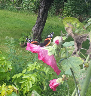 Hela trädgården är full av fjärilar. Här är en på stockrosen. I bakgrunden har vi plommonträd och där flyger ett moln av fjärilar upp när vi passerar, eftersom de sitter och suger i sig de ruttna plommonen som ligger på marken.