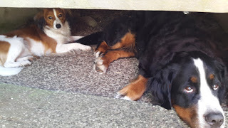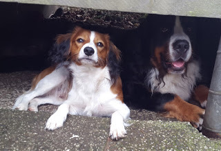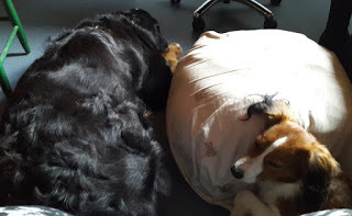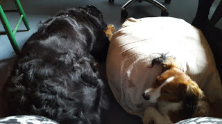 Jag läste research inför kommande bok och hundarna låg vid mina fötter när de inte pussade på varandra.