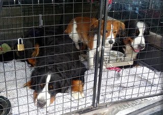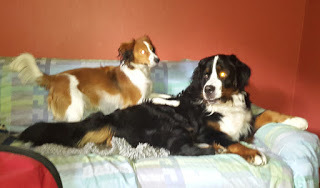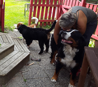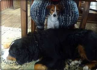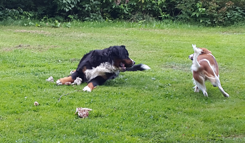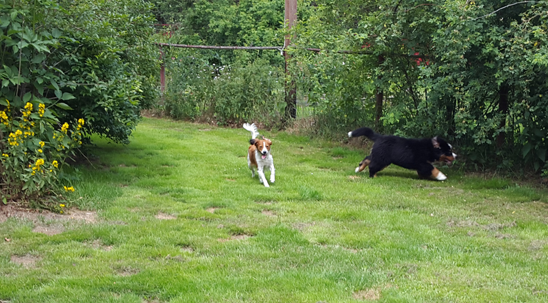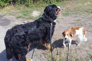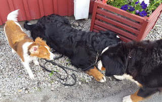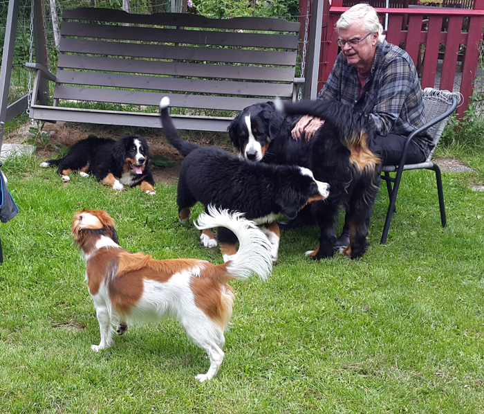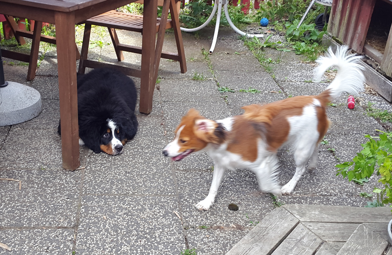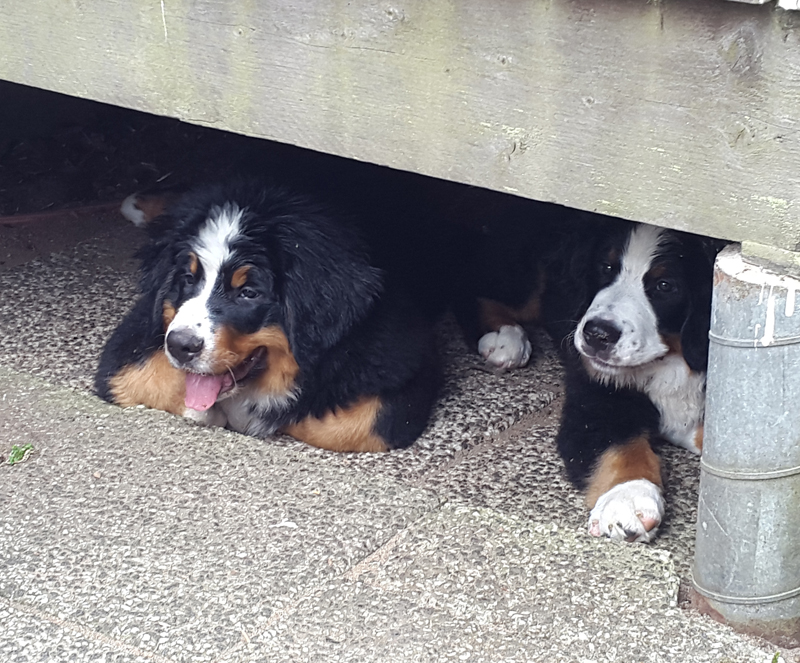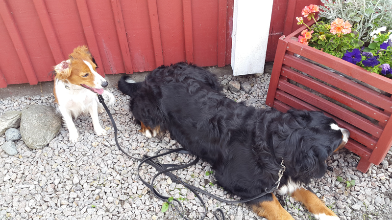 Så kom då M och M. De 14 veckor gamla Berner Sennenvalparna, ägda av Ulrika Wahlgren. Först morrade Kotten, men det skrämde inte de båda bröderna. De tog över hundgården och var trygga med varandra. Här är Kotten fortfarande lite avvaktande och Kiara söker stöd hos husse.