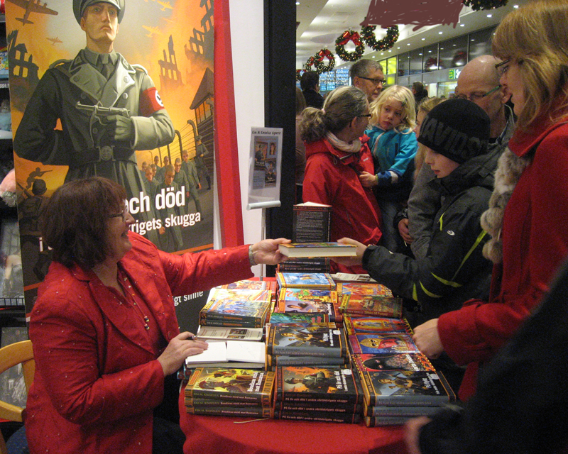 Karin Sallander säljer sin nya bok Ondskan i ett arv samt tidigare titlar. Alla ovanstående författare skriver fängslande, hudnära böcker.