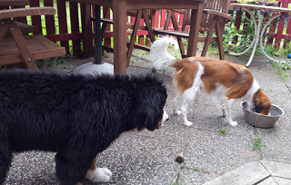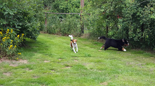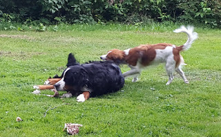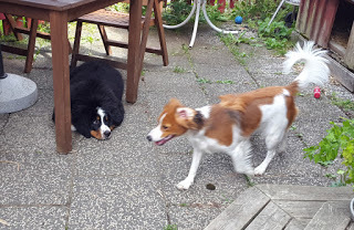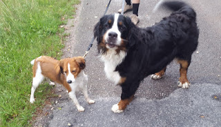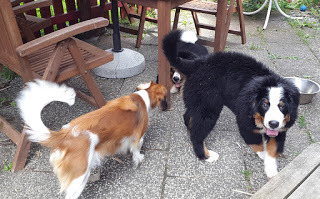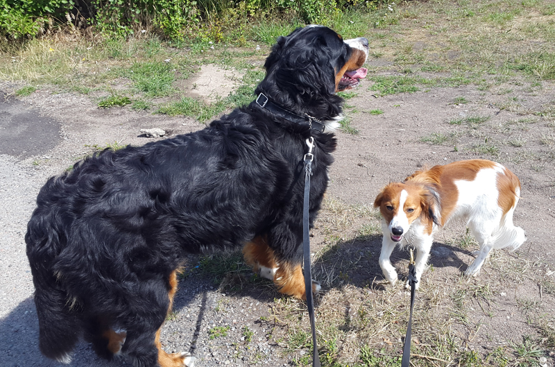 Kooikerhunden Kotten får besök av Berner Sennenvalparna M och M