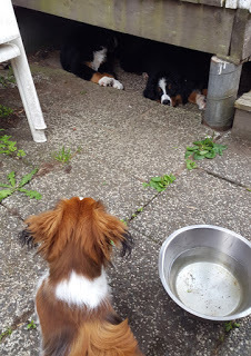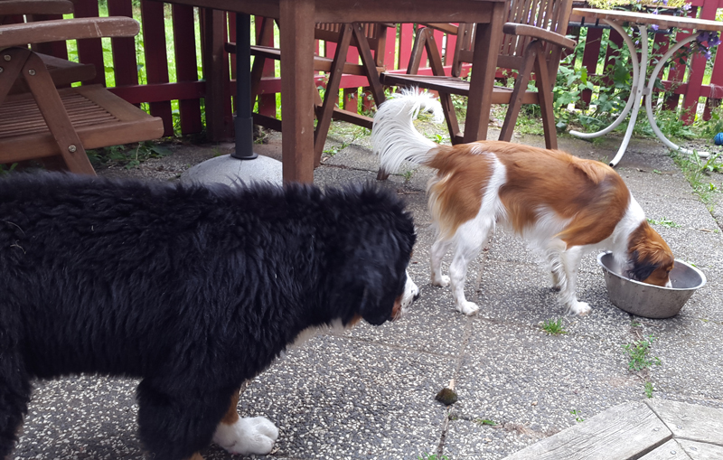 Men 14-veckors Bernervalpar orkar inte lika mycket som en 8-månaders Kooiker. Snart var det dags att söka skugga och vila för M och M.