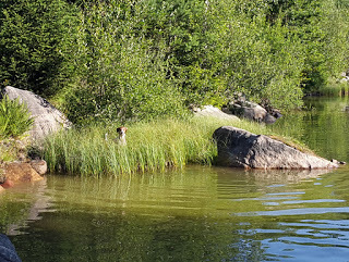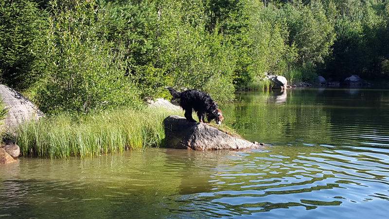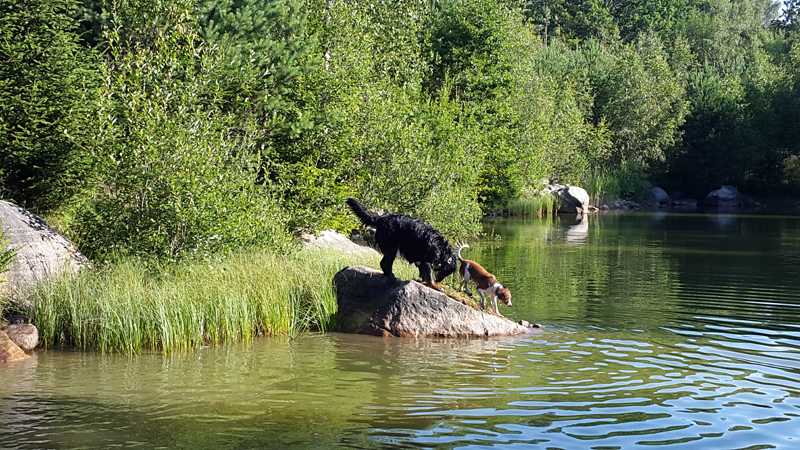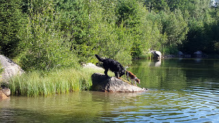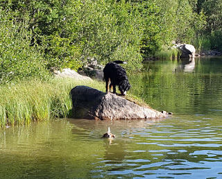 Vi har varit till dammen även denna vecka. Den här gången simmade Kotten fint. Han hittade även en sten som han kunde kasta sig i vattnet ifrån. Något han tyckte mycket om.