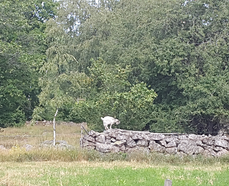 På långt håll hör jag en get som bräker och ser hur en liten killing har klättrat upp på stengärdsgården. När jag kommer närmare försöker mamma get locka ned sin lilla killing.