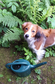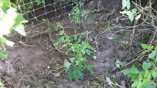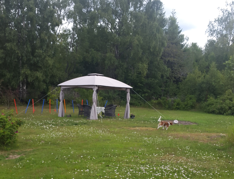 Det har hänt en hel del här den här veckan. Vi har fått besök av vildsvin. De har krupit in under vårt nät och börjat rumstera om i trädgården. På bilden ser man inte hur illa det är, men du kanske kan ana... Kiara och Kotten tyckte det var spännande dofter inne på tomten. Nu springer de dit varje gång vi tar en runda i trädgården. Vildsvinen har försökt ta sig in på ännu ett ställe, så även där har vi vildsvinssäkrat. Till hösten ska vi gå igenom hela staketet ut mot grannens mark där vildsvinen nu har slagit läger.