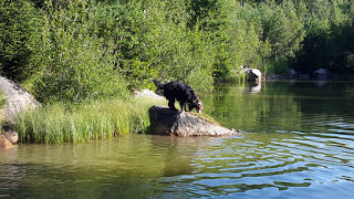 Kotten har fått ljusare hår på ryggen. Det ser ut som en toupé som sitter lös ovanpå den mörkare färgen. Ibland när han har badat i sjön står "toupén" ut som vingar på hans rygg. Rätt charmigt faktiskt. Jag undrar vad de säger på hundutställningen om det?