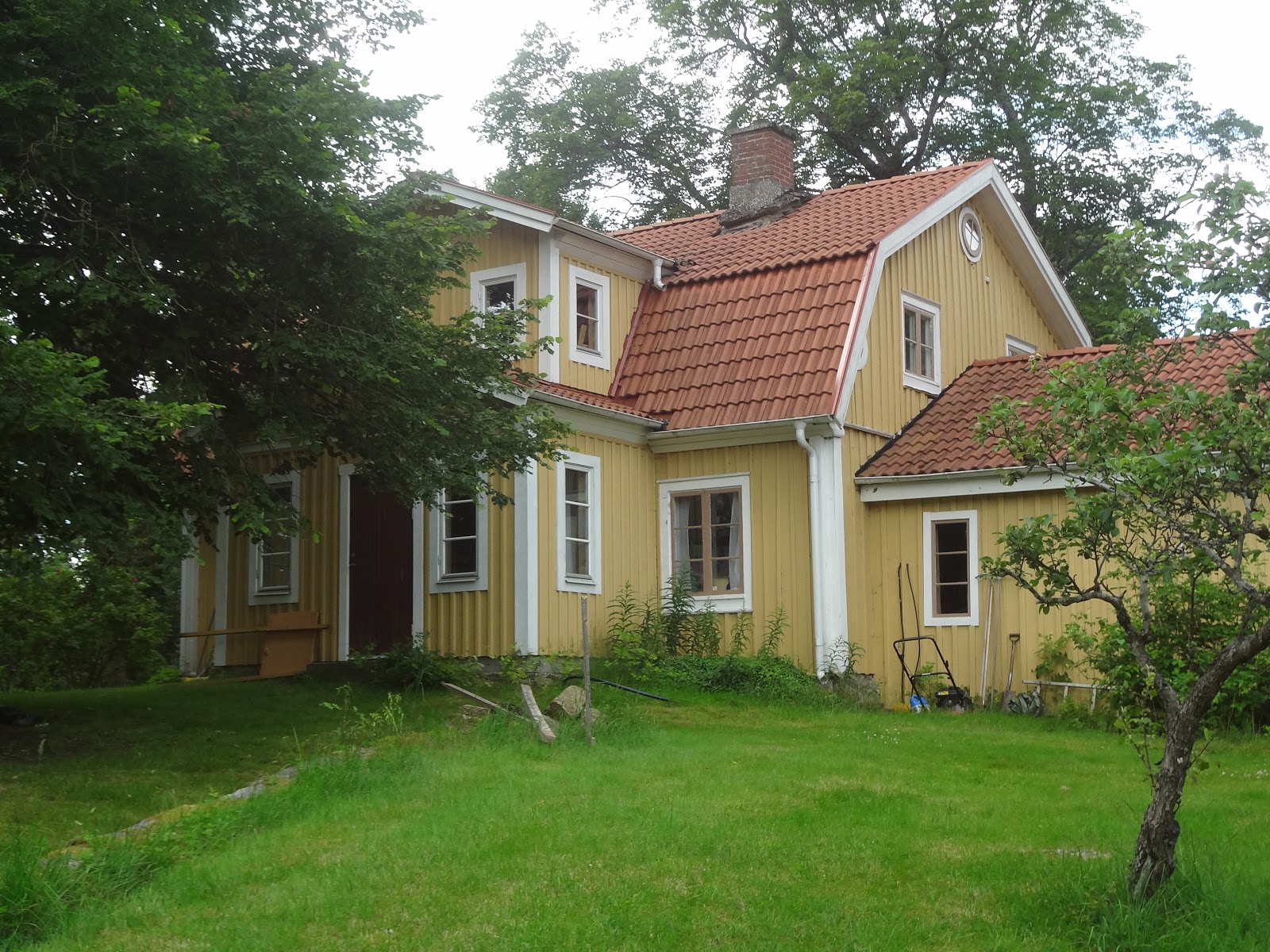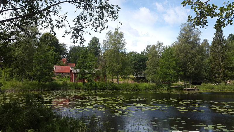 Det här fotot är taget från andra sidan sjö. Här ser du ladorna och hustaket på Färgargården, samt badbryggan.