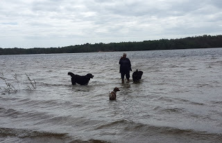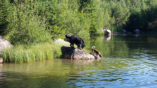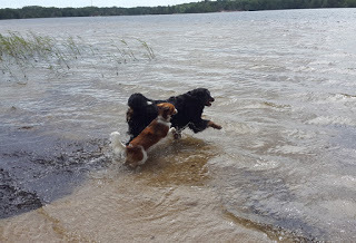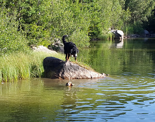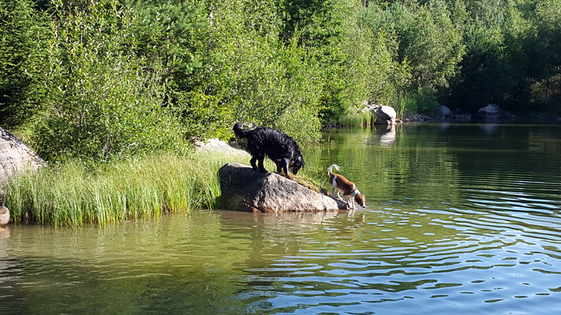 Jag tror djuren hade varit nyligen i sjön och druckit vatten, för det var grumligare än normalt i strandkanten. Men när vi var där var det helt tomt runt sjön. Kiara och Kotten slängde sig i och simmade och simmade. Kotten har nu lärt sig simma ordentligt. Han njuter av vartenda ögonblick.