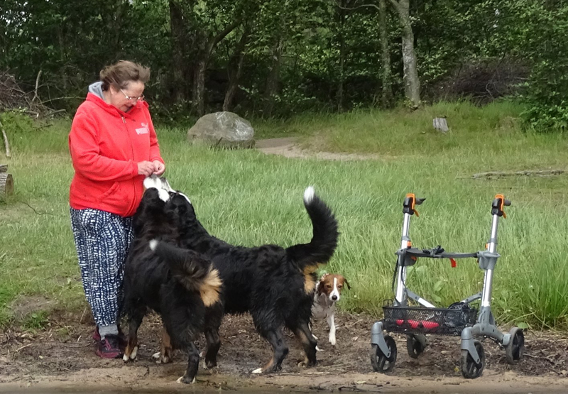 De vuxna hundarna är tillräckligt gamla för att ha lärt sig att hos matte finns det godis som belöning om man kommer till henne.
