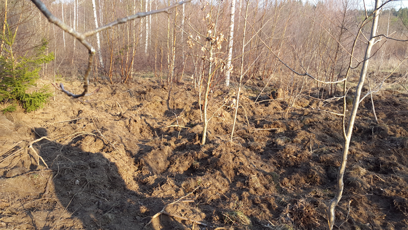 Så här såg det ut utanför vårt staket i våras. Vildsvinen hade skövlat alldeles intill vårt staket och till och med vällt omkull träden.