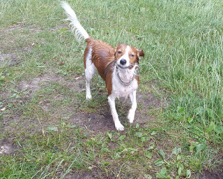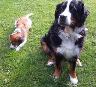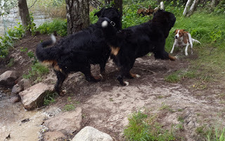 Kiara som varit så rädd hela veckan, för blåsten, för ledningar som ramlade ner över hundarna i hundgården när arbetare tog bort telefontrådar... Hon vågade knappt gå ut... Även hon har vuxit de senaste dagarna och på morgonpromenaden var det en glad, frimodig Kiara som följde med ut i skogen, utan att kasta ängsliga blickar upp mot träden. Istället jagade hon möss i det höga gräset, busade med både mig och Kotten och var så lycklig. Mitt hjärta svämmade över av kärlek.
