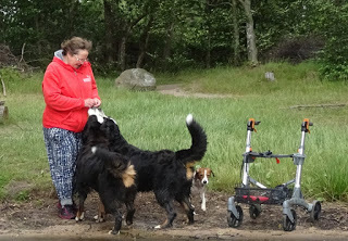 Det är en timmas promenad fram och tillbaka, i branta upp och nedförsbackar, bra träning både för matte och hundar. Som sällskap hade jag inte bara hundarna, utan även en läskigt spännande engelsk thriller i hörlurarna.