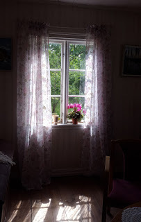 Det här är min favoritplats på Färgargården. I det här rummet sitter jag och läser kursdeltagarnas berättelser. Solen tittar in från två håll, eftersom det är ett hörnrum. Det är inte bara jag som trivs i det här rummet. När detta foto togs hade ännu ingen deltagare kommit.
