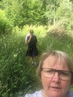 Byalaget håller på att göra en promenadväg runt sjön. Jag skickade ut de först anlände skrivkursdeltagarna på en promenad. De tog bildbevis för att visa mig att det inte alls var röjt runt hela sjön som jag hade fått höra.
