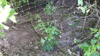 Måste berätta något otäckt också. Precis när jag arbetat klart i trädgården för kvällen igår, skulle jag träna hundarna. Då upptäckte jag till min förskräckelse att vildsvinskultingarna hade grävt sig in under vårt staket och härjat runt i den del av trädgården där vi har alla våra odlingar. Som tur var hade de inte hunnit så långt, men de hade förstört en hel del.