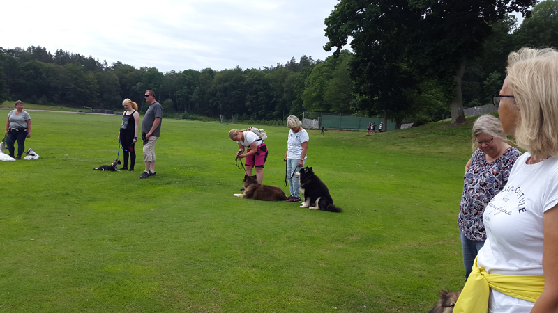 Efter rundan var det samling på den stora gräsplanen. Jag räknade till 26 ekipage, varav några hade flera hundar. Alla deltagarna fick presenter, inte jag, utan hundarna. Kotten och Kiara fick hundgodis, bajspåsar och en leksak som de älskar. Här är det pusskalas medan vi väntar på utdelningen av godispåsarna.