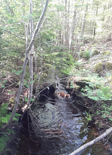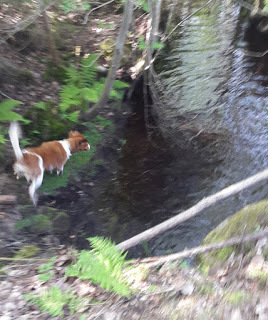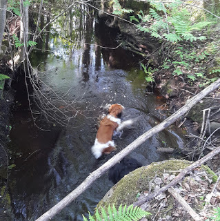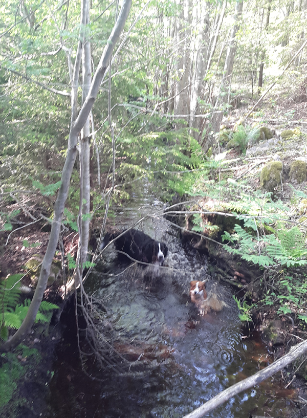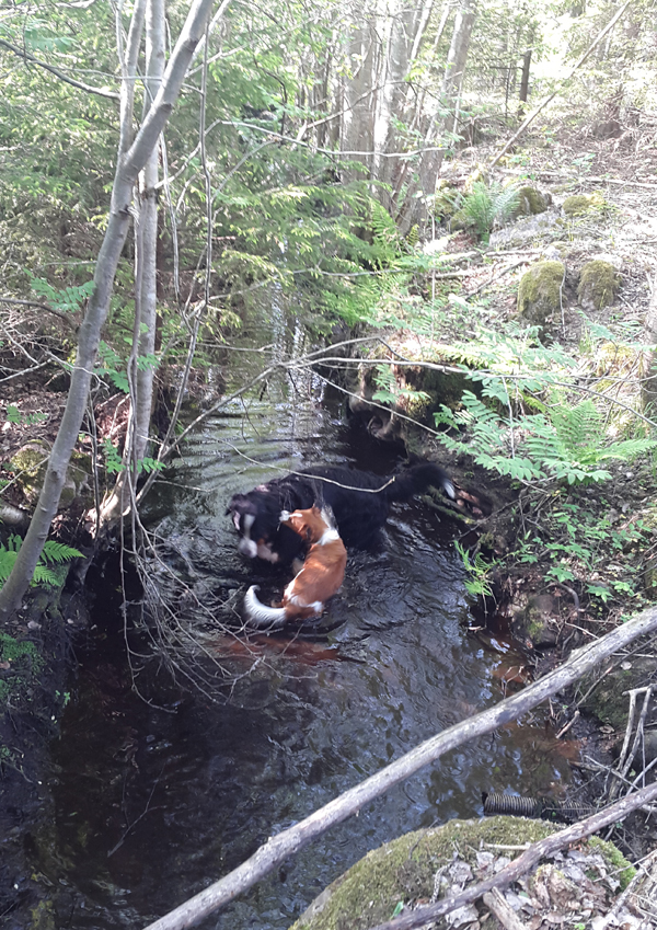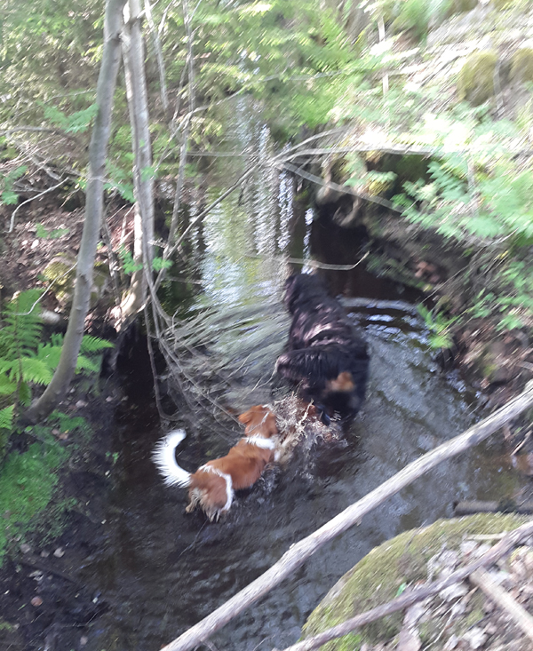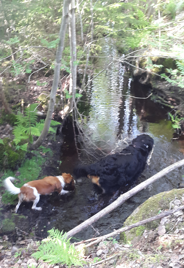 Kiara älskar vatten lika mycket som Kotten och de har jättekul tillsammans. Bäcken är lång och bred och de vandrar en bra bit bort i den.