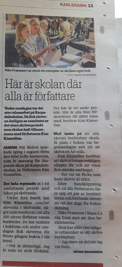 Att få följa eleverna från skolstart i augusti till veckan före skolavslutningen, det är något jag aldrig har gjort tidigare, men gärna gör om. Det var så roligt att få vara med om att skapa 350 nya författare. För det var många som hade skrivit betydligt fler än den A-4-sida de fick skriva. En flicka hade skrivit 45 sidor och varit uppe halva natten. Hon blev väldigt besviken. Men jag tror nog inte hon lägger författarplanerna på is för det, utan fortsätter skriva.