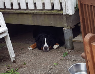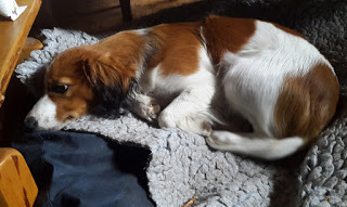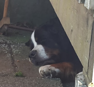 Hemma igen var hundarna så trötta. Huset var strömlöst, för även hemma hos oss, en timma från hotellet, hade åskovädret härjat. Det tog många timmar innan vi hade fått strömmen tillbaka, men vad brydde hundarna sig om det. De ville bara sova.