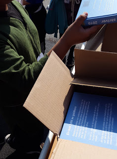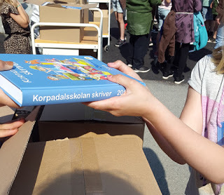 Det var mycket välordnat vid utdelningen av böckerna. Bokvagnar hade körts ut medan jag läste den sista avslutande berättelsen. Skyltar som talade om vilken klass det gällde satt vid varje vagn och eleverna ställde sig lugnt och städat i kö för att få sitt exemplar.