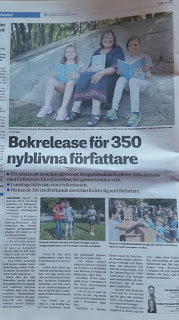 Dagen då eleverna skulle få sina egna exemplar var en strålande sommardag. Radio, BLT och Sydöstran ville gärna dela nyheten med oss. Vid niotiden satt jag, Sofie Andersson och två elever bänkade i rektorns rum och väntade på telefonsamtalen, som inte kom. Vi såg ängsligt på varandra. Jag tittade om jag hade täckning, jodå. Till slut ringde Daniel från Sveriges Radio P4 Blekinge. Han hade försökt ringa mig på messenger först, men det har jag inte i min mobil. Därav fördröjningen. Men till slut gick allt bra. Barnen hade varit nervösa, men de skötte sig jättebra.