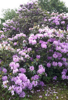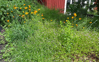 Om du tittar på vår "gräsmatta" ser du att det inte längre är så mycket gräs. Förra sommarens torka tog död på gräset och det kom annan växtlighet istället. Jag tycker det är vackert, för det är små, små blommor. Dessutom blir det inte så mycket gräs som behöver klippas.
