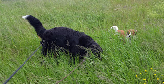 Men inte alltför långt bort, för då ropar matte, så hundarna vänder där de vet att gränsen går, för det är trots allt koppeltvång och kopplet åker på så fort hundarna kommer upp ur diket.