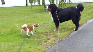 Däremot blev det inte lika många långpromenader som jag hade tänkt mig. Då var det tur att jag hade flexikoppel i bilen och att det låg en stor äng bakom hotellet. Där kunde hundarna busa runt och bli av med energi.