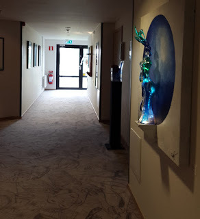 Det var glaskonst överallt. Precis här svängde vi till vänster, in i vår korridor. Här var ett litet utrymme med soffor och ett stort glasbord som kostade många, många, många, många, många tusenlappar. Jag var livrädd för att hundarna skulle välta det och ha sönder det. När jag gick där utan hundarna kände jag på det. Jag kunde inte rubba bordet. Vilken lättnad. Vi klarade hela hotellvistelsen utan att ha sönder något och vi hade en helt fantastisk upplevelse.