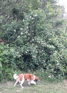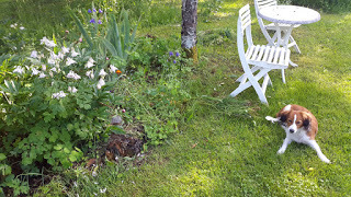 Trädgården är som ljuvligast just nu, nästan allt blommar. Kotten tycker det är spännande med alla humlor, bin och fjärilar. Han skuttar glatt omkring för att fånga dem.