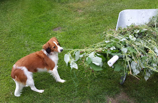 Min hjälpreda Kotten. Jag lägger upp skräpet i skottkärran och Kotten drar av det igen...