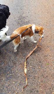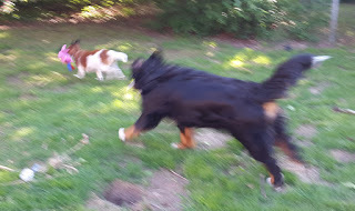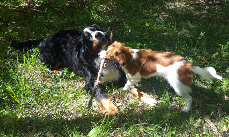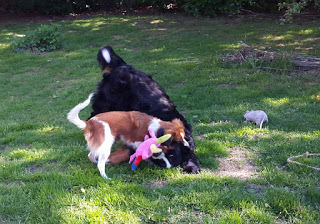 På eftermiddagen tittade solen fram och Kiara och Kotten lekte för fullt med en pinne. Jag trodde att Kotten skulle ligga utslagen hela eftermiddagen efter de många simturerna, men han var lika pigg som vanligt och vi tränade, gosade och lekte.