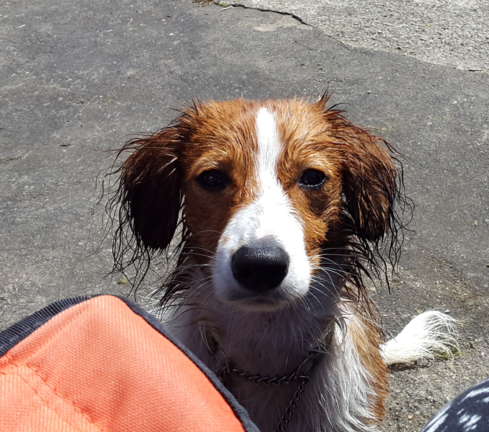 När alla andra gick iväg på promenad stannade vi kvar, bytte till flexikoppel och sedan var det dags för vattenbus. Först hittade vi inget bra ställe att gå ner vid, så Kotten hoppade ut och simmade med sprattlande framben tills han fick fast mark under sig igen. Medan Kiara simmade fram och tillbaka och njöt av simturen.
