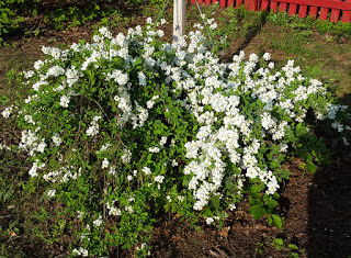 "Blomstervattenfallet" kallar jag den här busken eftersom den bara växer åt ett håll och ser ut som ett vattenfall av vita blommor.